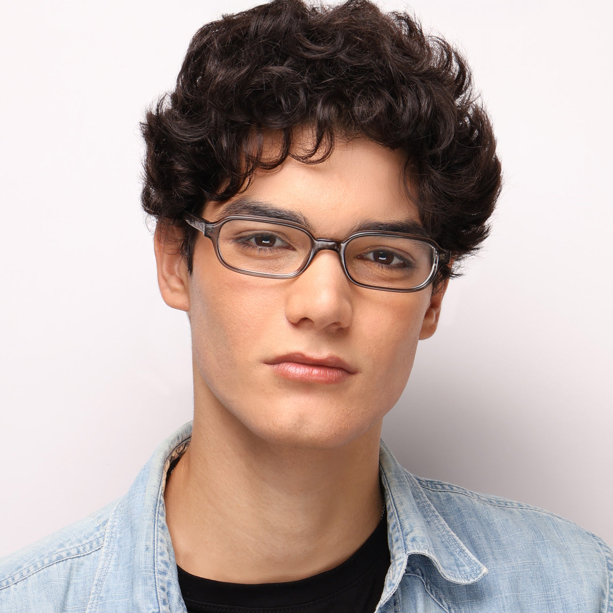 Óculos Keno Grafite grau com haste de acetato em modelo com rosto médio.
