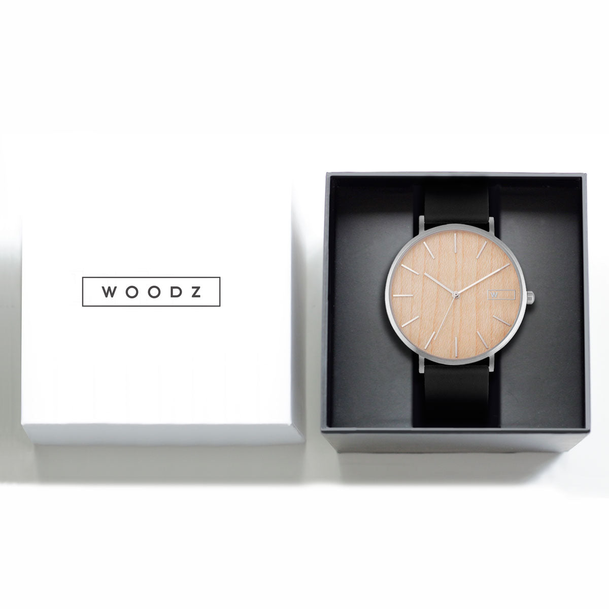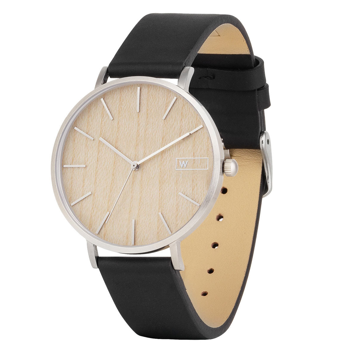 Modelo clean e elegante, com uma caixa ultra fina de aço inoxidável prata escovado e mostrador de madeira natural de reflorestamento.