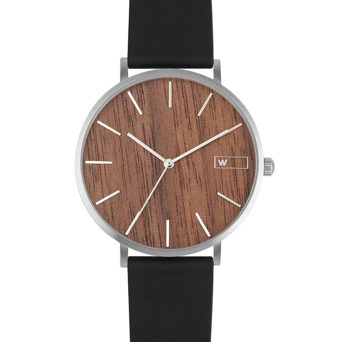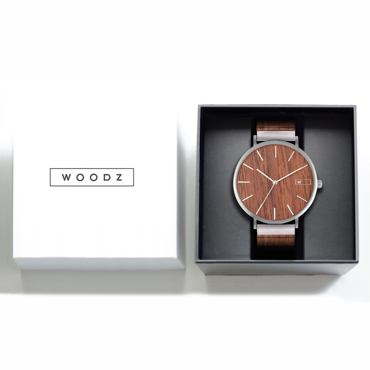 • Material: Caixa fina em aço inoxidável com mostrador feito à mão em madeira Walnut de reflorestamento. Possui um pequeno calendário para marcar os dias do mês. E ponteiros com uma fina faixa branca luminosa que brilha no escuro.