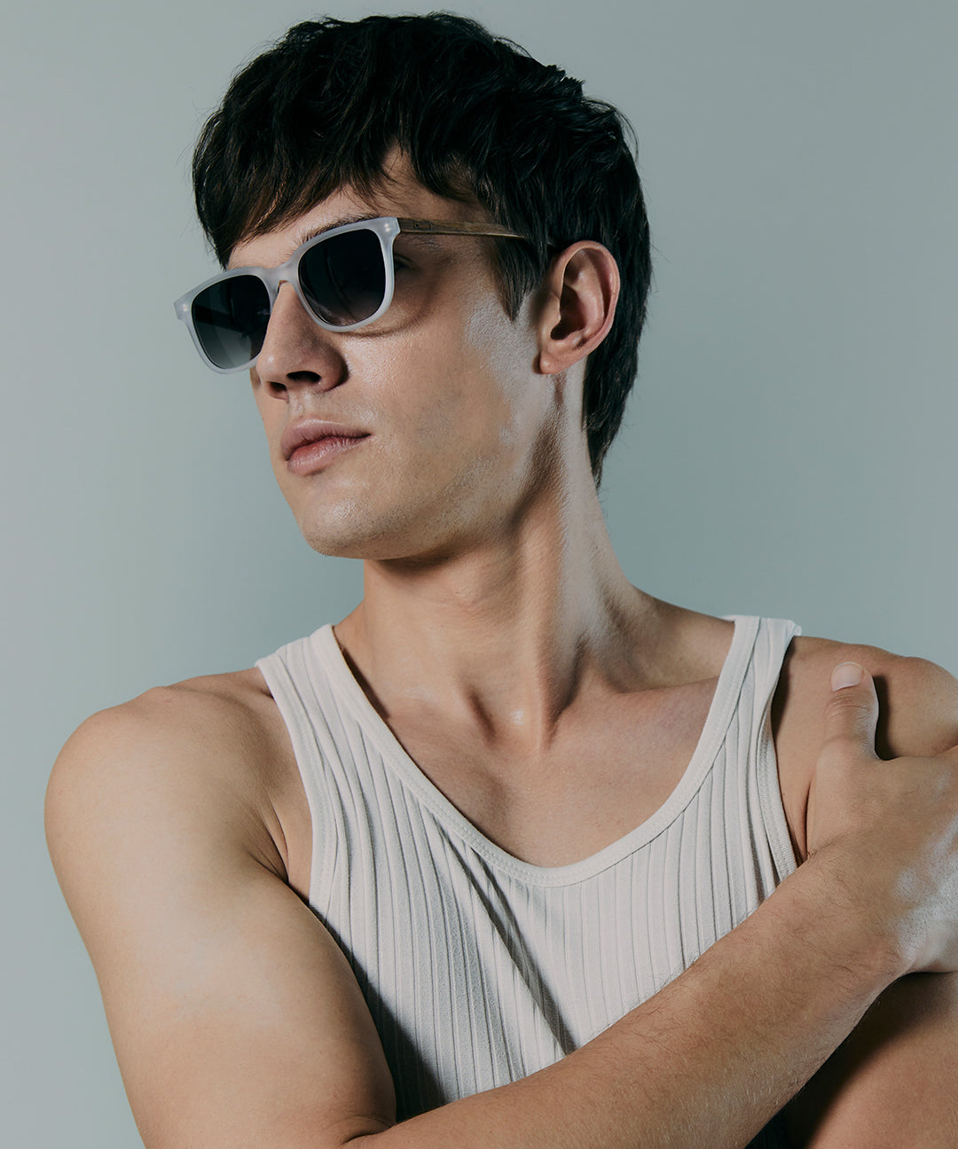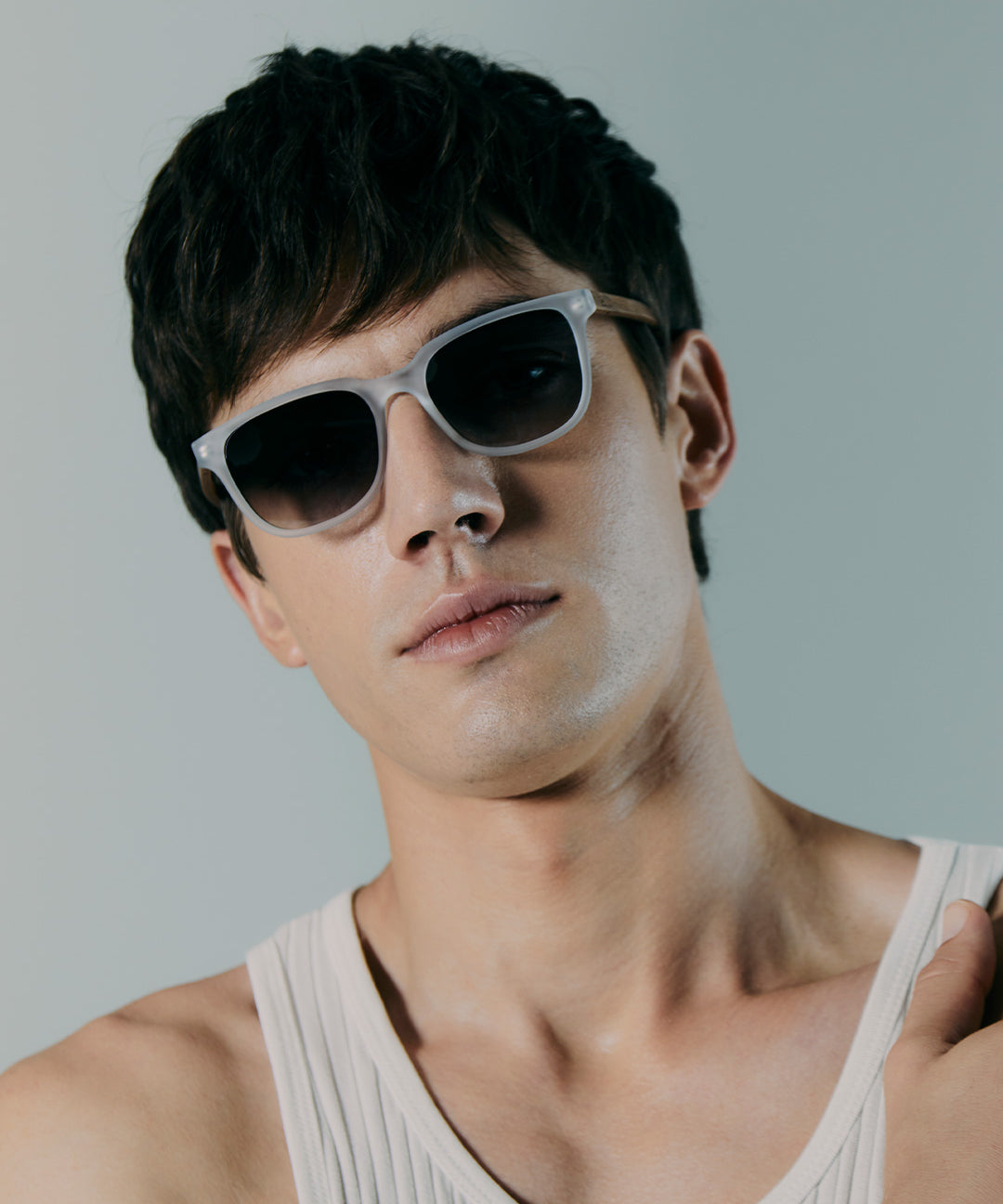 Óculos Carter Cristal Fosco em modelo com rosto médio.