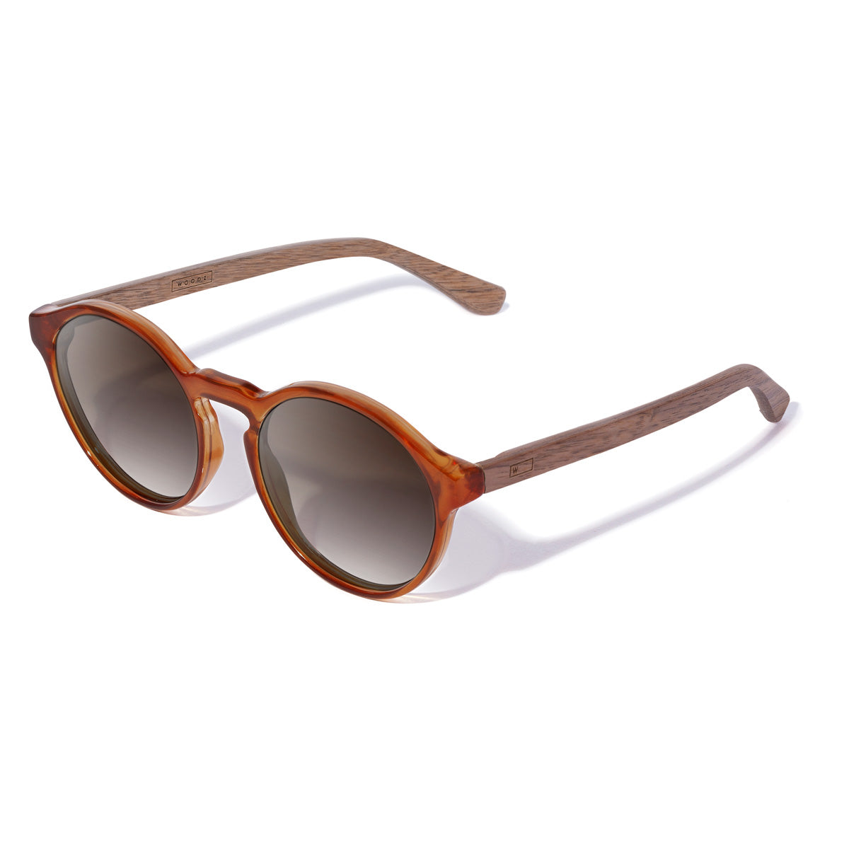 Champagne, em Bio Acetato com haste de Madeira e lente Marrom Degradê.