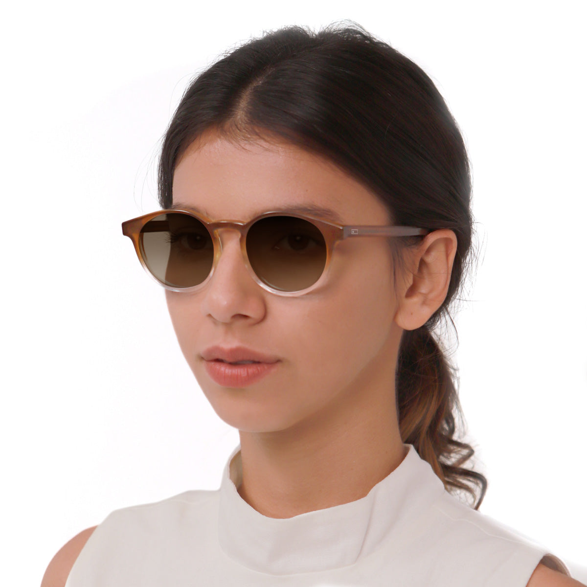 Óculos Taylor Camel Fosco em modelo com rosto pequeno.
