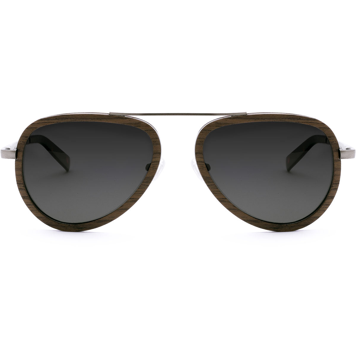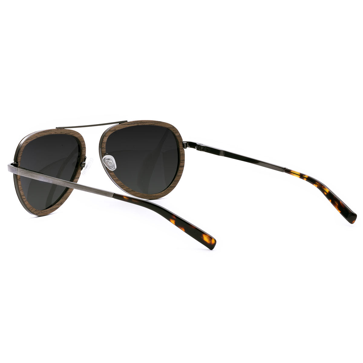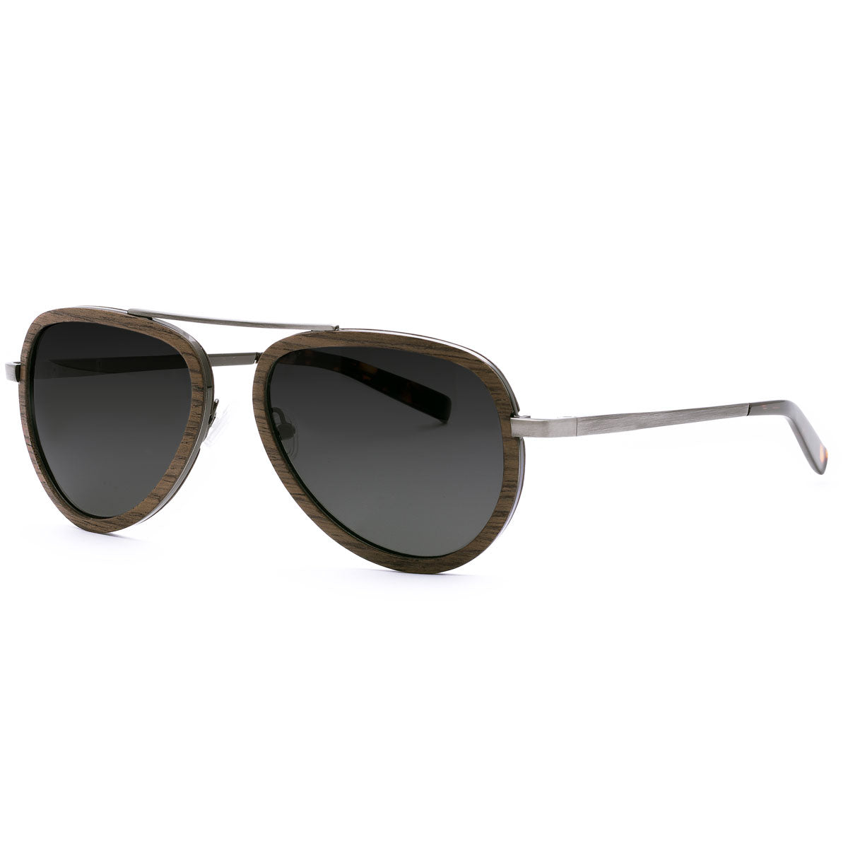 Releitura moderna do clássico aviador em aço inoxidável com a frente em madeira Walnut e a ponta da haste em acetato tortoise. Possui plaquetas de silicone no encaixe com o nariz para melhor ajuste ao rosto.