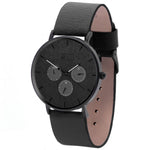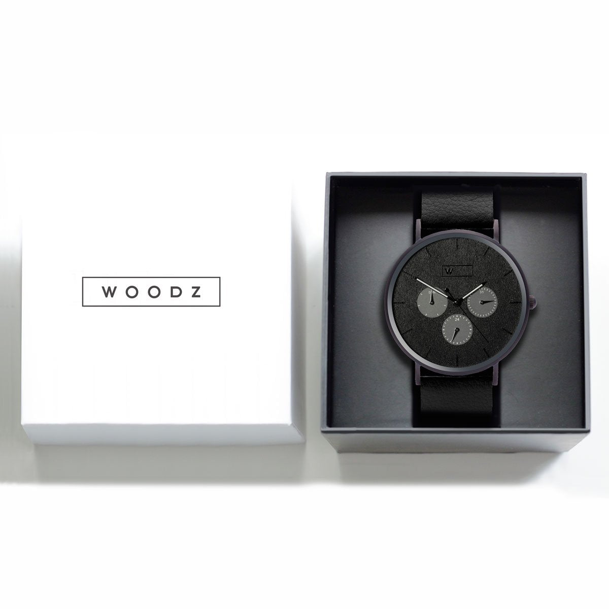 Relógio multifuncional com 3 cronógrafos , uma combinação perfeita de tecnologia, design e madeira. Com uma caixa ultra fina de aço inoxidável preta fosca, mostrador de madeira ébano natural e ponteiros com um fina faixa branca que brilha no escuro.
