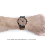 Relógio minimalista com mostrador em madeira natural e uma caixa fina de aço inoxidável preto fosco. Possui um pequeno e discreto calendário e ponteiros com um fina faixa luminosa para ver a hora no escuro.