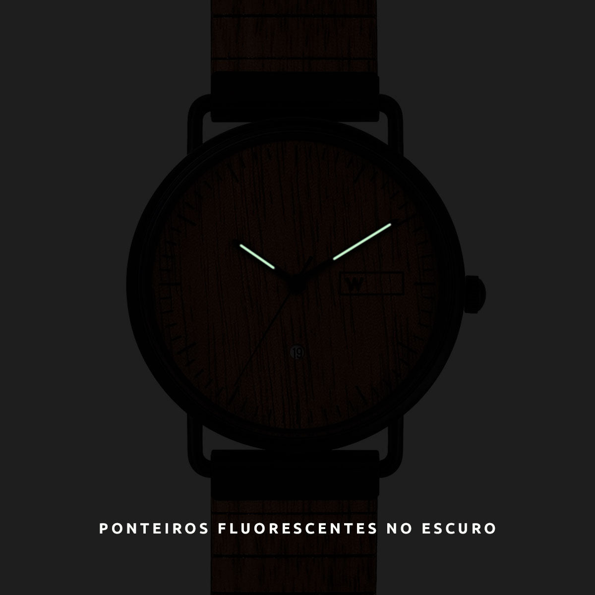 - Material: Caixa fina em aço inoxidável com mostrador feito à mão em madeira Walnut de reflorestamento. Possui um pequeno calendário para marcar os dias do mês. E ponteiros com uma fina faixa branca luminosa que brilha no escuro.