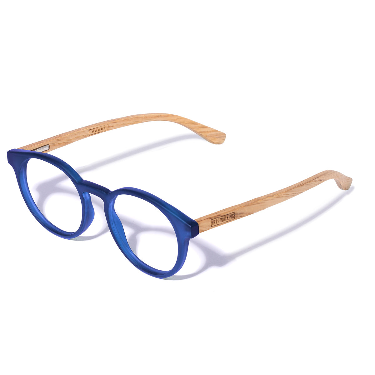 Olli da Coleção Especial Woodz x Johnnie Walker com a frente de bio acetato e haste de madeira reciclada do barril de whisky, na cor Blue Label.