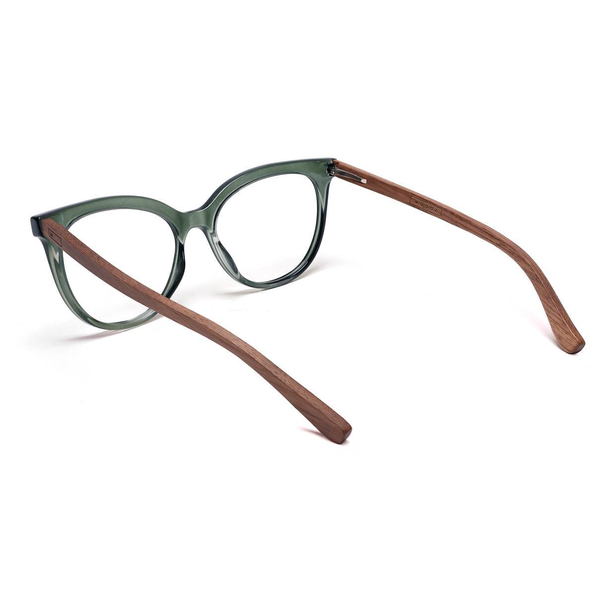 Óculos Ava Green grau com haste de acetato em modelo com rosto médio.