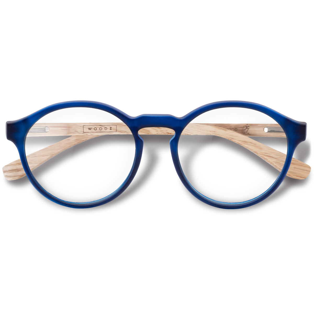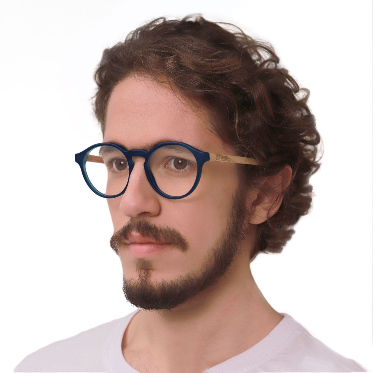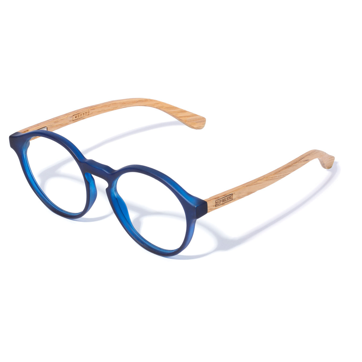 Olli da Coleção Especial Woodz x Johnnie Walker com a frente de bio acetato e haste de madeira reciclada do barril de whisky, na cor Blue Label.