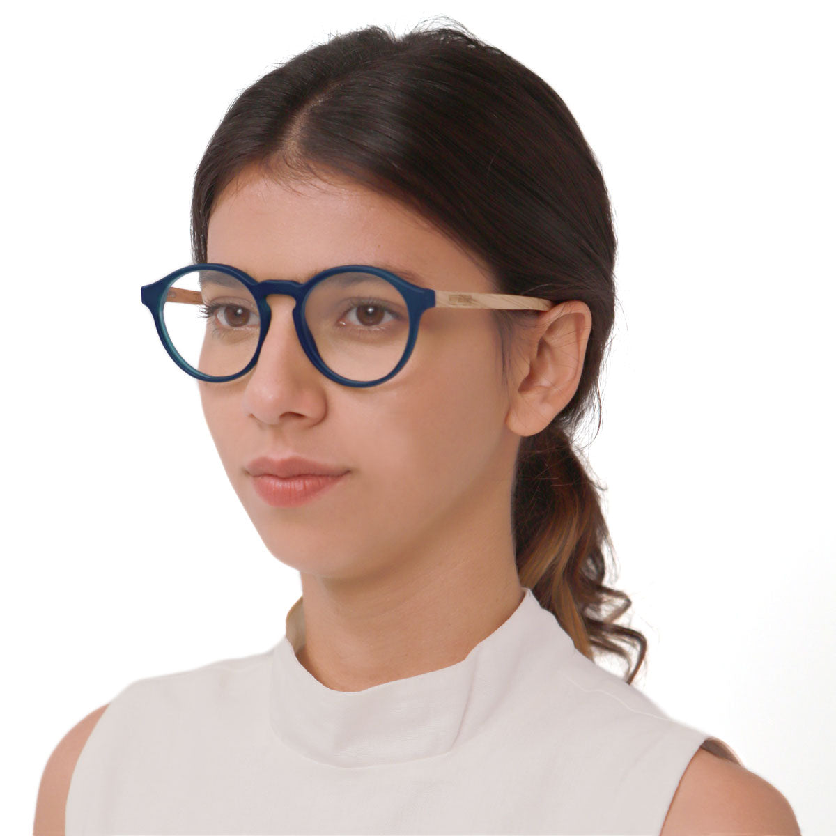 Armação Elli JW Blue Label em modelo com rosto médio.
