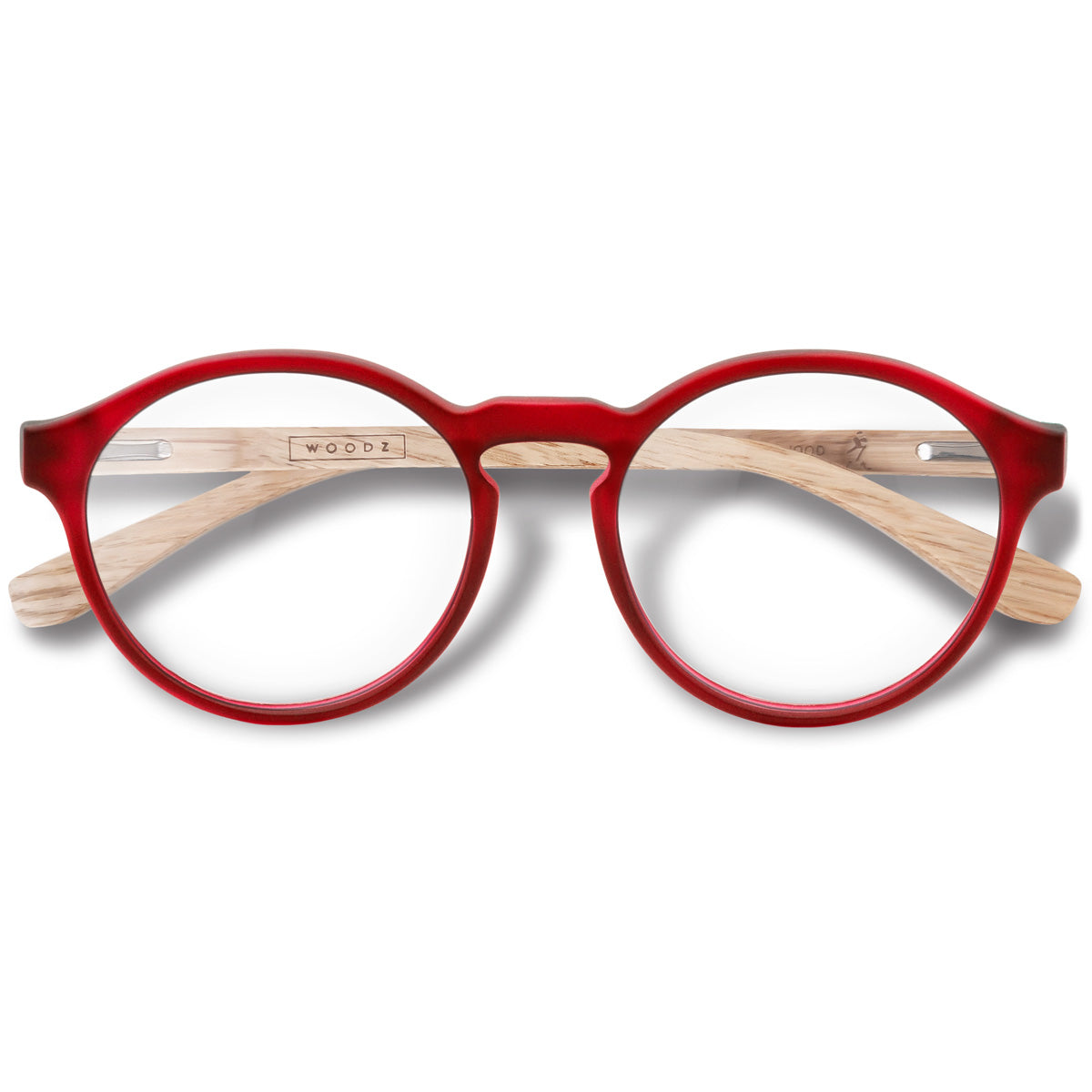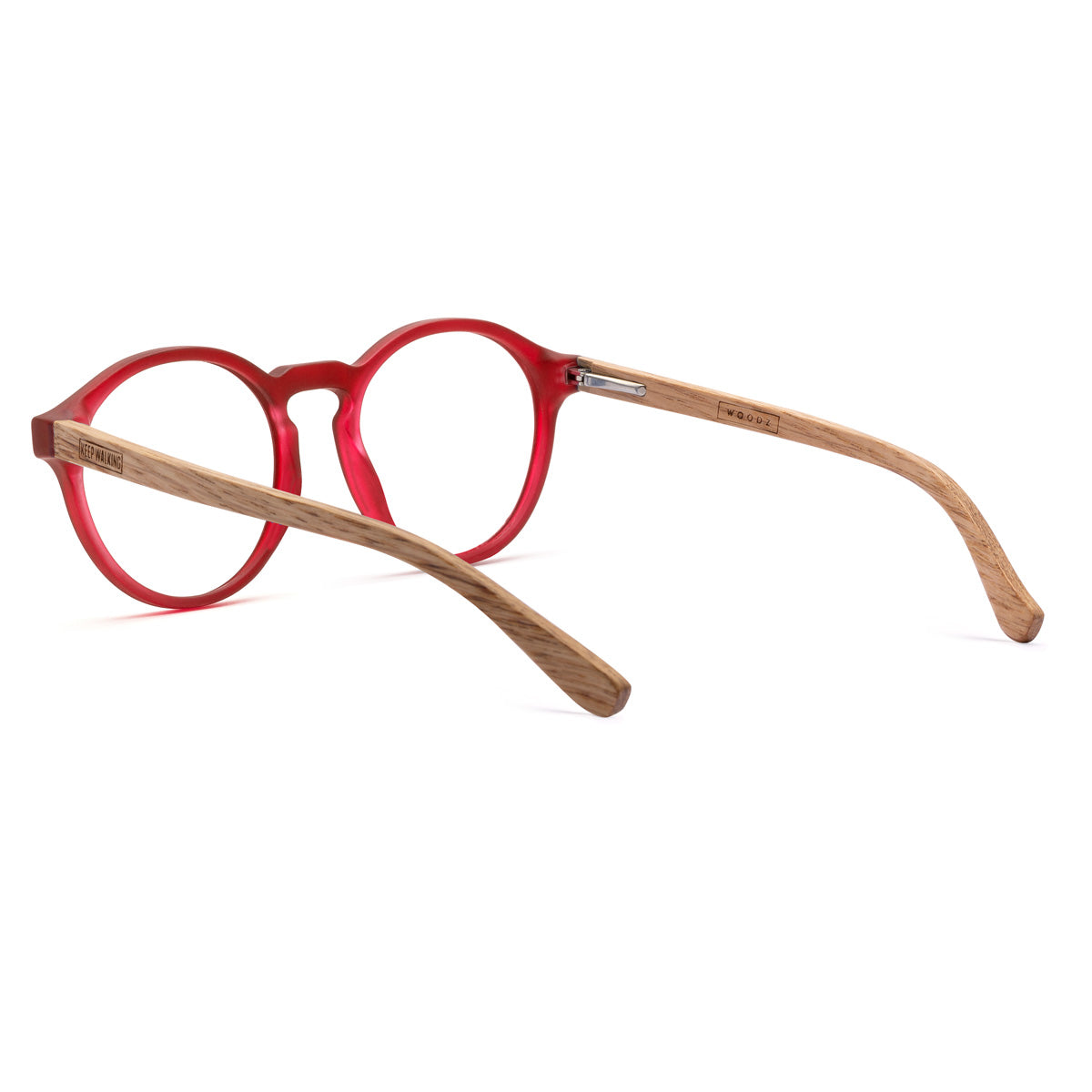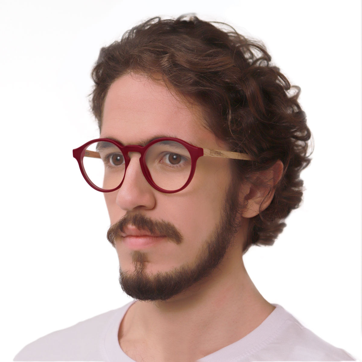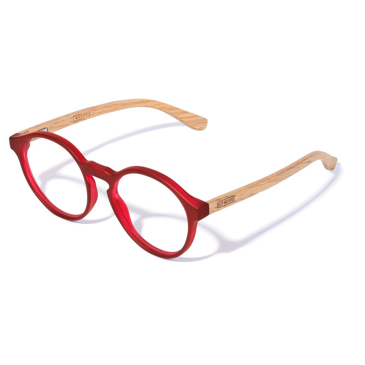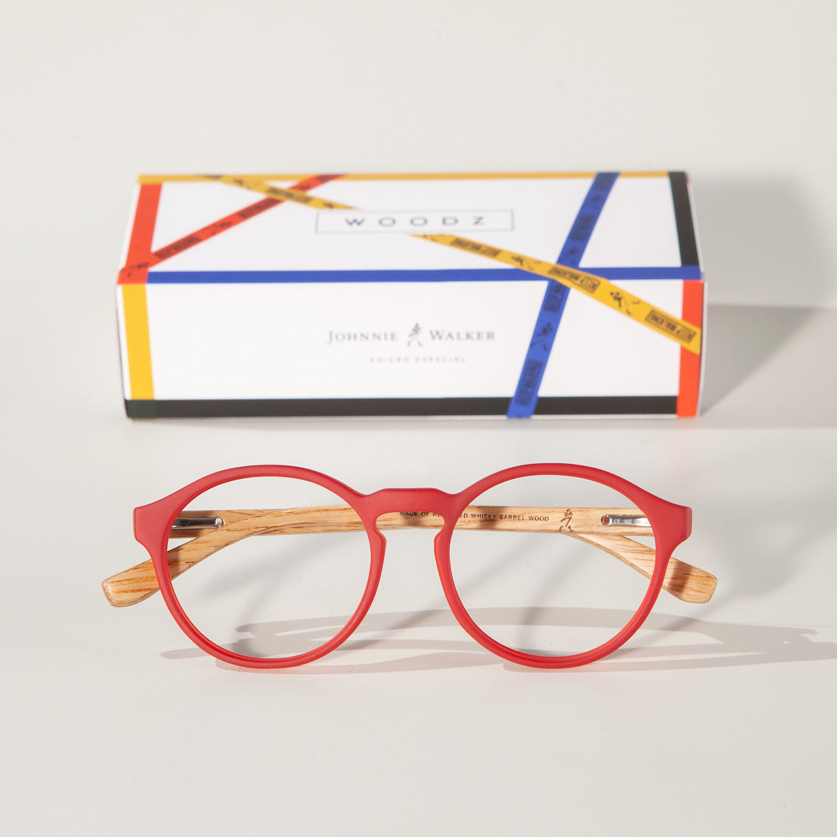 Elli da Coleção Especial Woodz x Johnnie Walker com a frente de bio acetato e haste de madeira reciclada do barril de whisky, na cor Red Label.