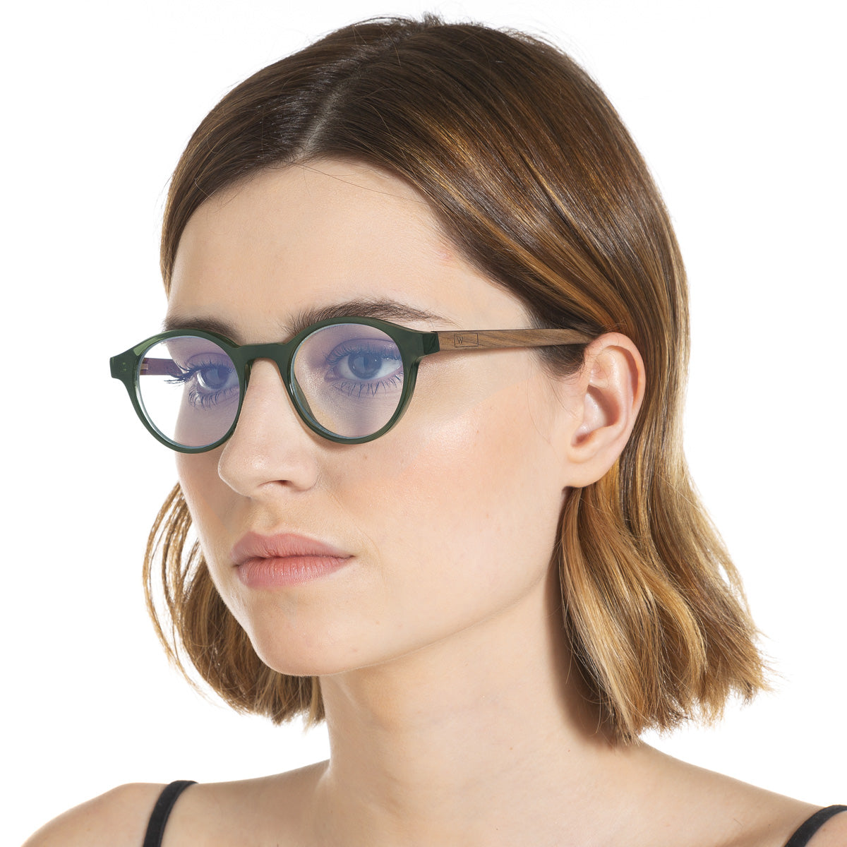 Armação Nino Menta em modelo com rosto pequeno.