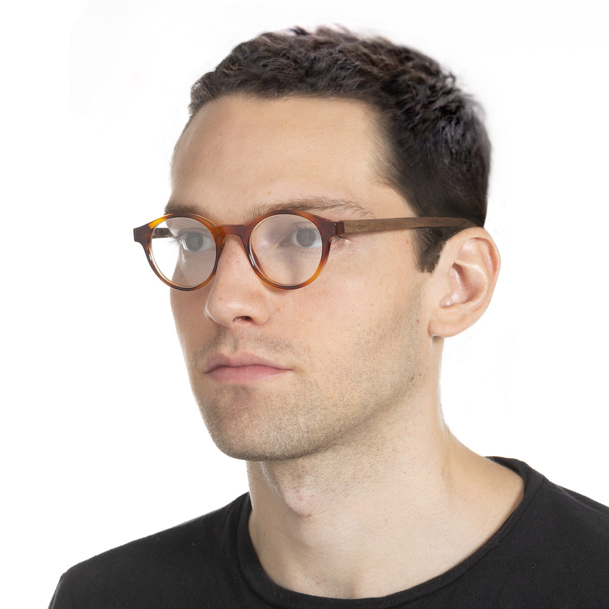 Armação Nino Tortoise em modelo com rosto médio.
