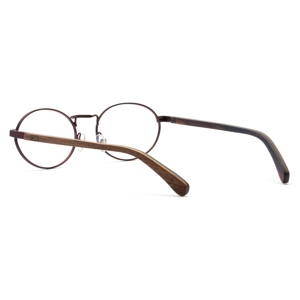 Armação de metal oval vinho em modelo com rosto pequeno.