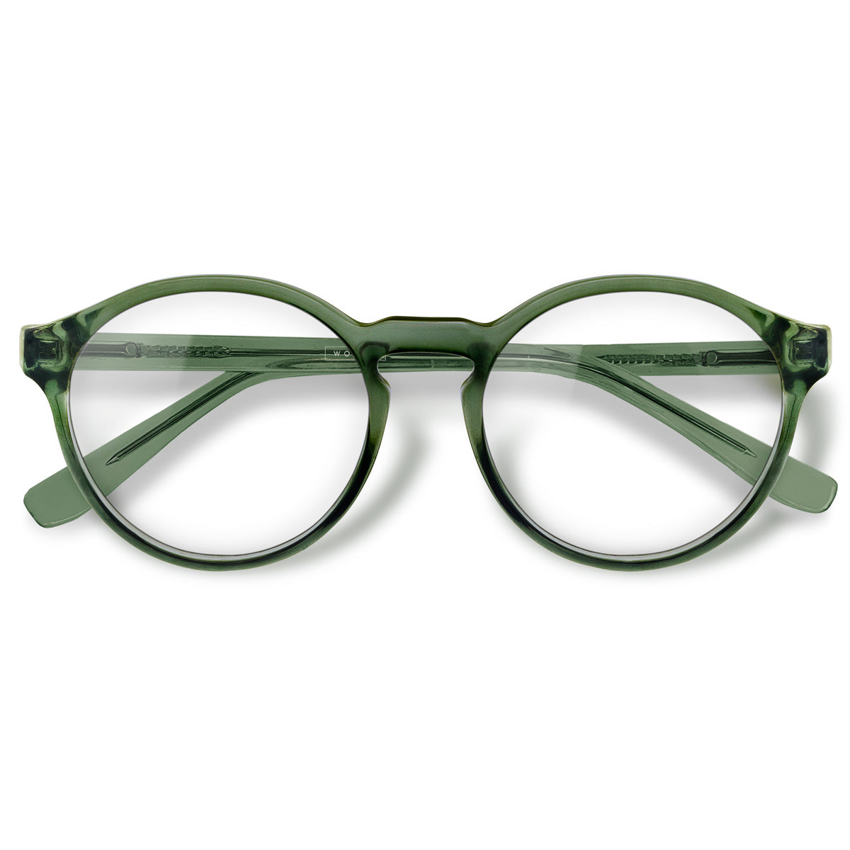 Design redondo clássico em tamanho grande, mas com espessura fina e leve, ideal para quem tem rosto médio para grande.