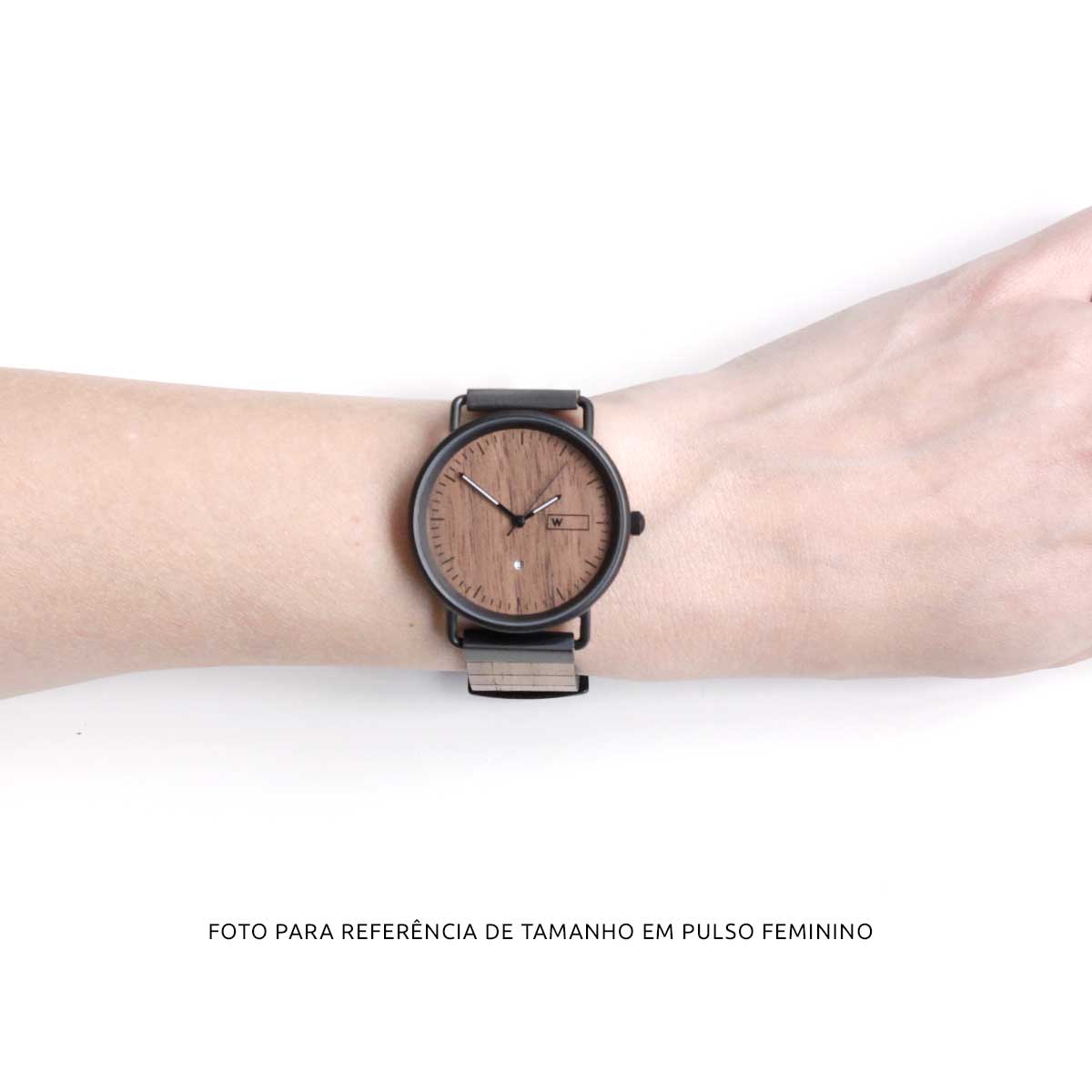 Relógio minimalista com mostrador em madeira natural e uma caixa fina de aço inoxidável preto fosco. Possui um pequeno e discreto calendário e ponteiros com um fina faixa luminosa para ver a hora no escuro.