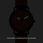 - Material: Caixa fina em aço inoxidável com mostrador feito à mão em madeira Walnut de reflorestamento. Possui um pequeno calendário para marcar os dias do mês. E ponteiros com uma fina faixa branca luminosa que brilha no escuro.